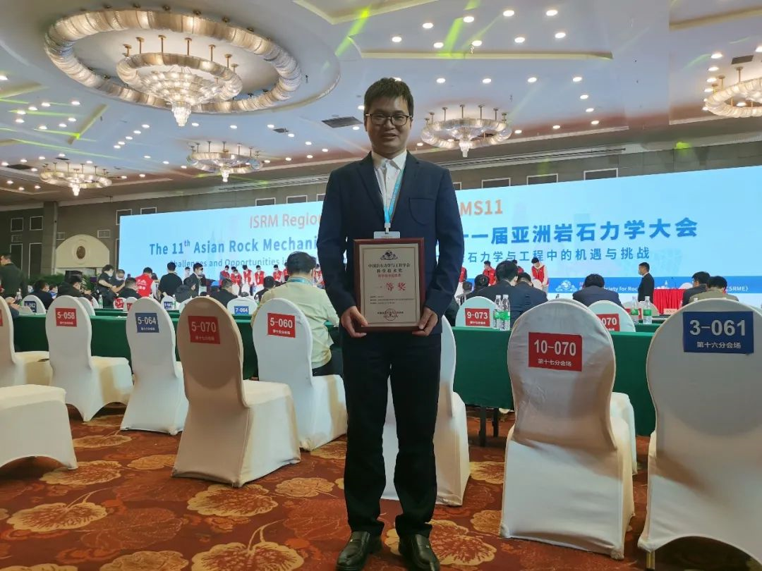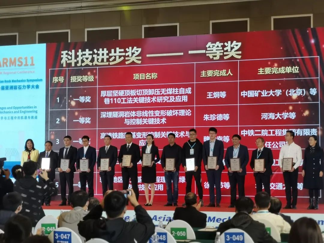 朱万成教授作为项目负责人完成的"金属矿采空区稳定性综合评价方法与矿柱高效回收技术“项目,获得了中国岩石力学与工程学会科技进步奖一等奖。在闭幕式颁奖仪式上,关凯老师代表课题组上台领奖。